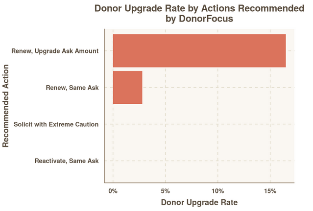 Look at that ‘Upgrade’ group! Using past data, this organization could have identified a group of real superstars. The donor rate was phenomenal, and the upgrader rate was over 5 times the rate of the ‘Same Ask’ folks!