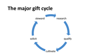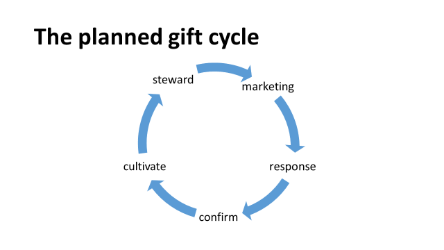 In a couple of weeks I’m going to suggest a few ideas that may work for you as well as they have worked for me in engendering a positive, collaborative environment without dampening the competitive spirit we need to be good fundraisers. I will also let you know why “solicitation” is missing from the PG cycle and where it has gone. I’ll leave you with one last question to answer below: What do planned gift counting policies have to do with collaboration, blended gifts and performance metrics?