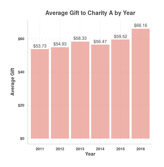 Bar graphs are hugely useful in data visualization. Here I’ve graphed the average gift given to a particular charity each year from 2011 through to 2016.