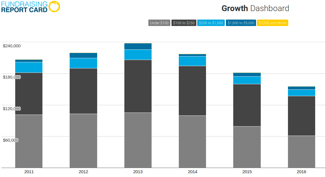 Remember my caveat above about the simple bar graph? Here’s data from the same charity, where donation totals each year are broken out and stacked according to how big each donation is (the colours are the levels). Accordingly, you can see that donation dollars from the lowest level (under $100) have actually declined since 2013, whereas the higher level donations have thankfully been staying steady. This would explain why the average gift has been going up over the years!